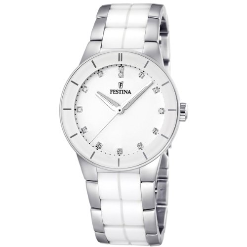 Cette montre Femme de la marque FESTINA, référence F16531/3, est une montre mode. Elle se caractérise par un boitier rond en acier et céramique avec strass et céramique, un cadran blanc, un verre minéral, un mouvement quartz et un bracelet acier & céramique . Son affichage est analogique (3 aiguilles).