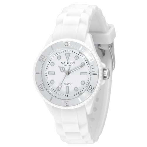 Description de l'article pourMadison New York - SL4167B - Montre Mixte - Quartz Analogique - Cadran Blanc - Bracelet Silicone Blanc