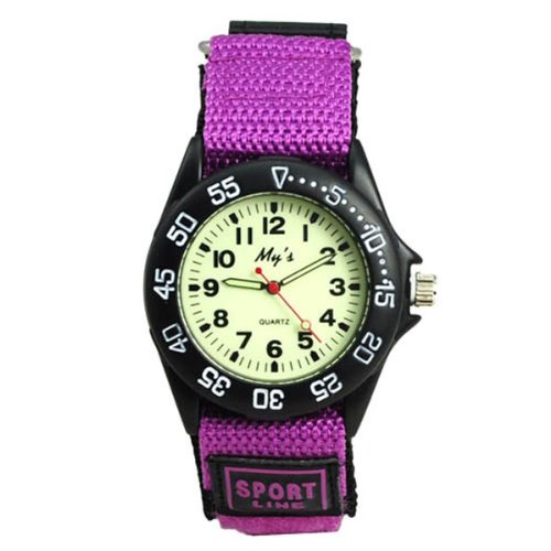 Convient parfaitement pour tous les élèves du primaire et du secondaire Mouvements : Quartz Affichage : Analogue Bracelet fait de nylon tissé Boitier fait d’acier inoxydable Fermoir en Velcro Spécifications: Couleur du Bracelet : violet Forme du cadran : Ronde Couleur du Cadran : Lumineuse Diamètre du Cadran : 2,4cm/ 0,9in Largeur du Cadran : 2,0cm/0,8 Le paquet comprend: 1xMontre